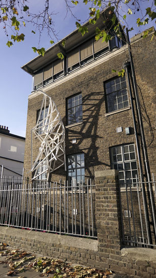 Curated by Vicky Richardson for her new agency Inter, Right to Climb is an installation by Kurdish-Iraqi Walid Siti (b.1954) that expresses the irrepressible spirit of art and its importance in the public realm. Siti’s twisting tower emerges from the facade of a former railway building in Camden Town. Its underlying geometry breaks down as the structure grows towards the sky.